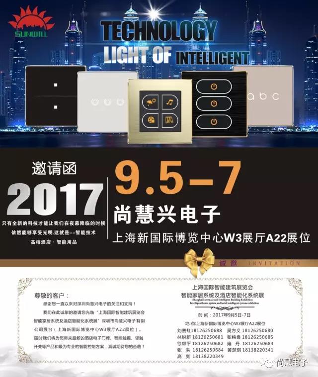 深圳市尚慧興電子有限公司展臺(tái)(上海新國(guó)際博覽中心W3展廳A22展位),本次展會(huì)我們將為您帶來新的定制電子門牌、智能觸摸開關(guān)、輕觸開關(guān)等產(chǎn)品和專業(yè)的智能控制方案,真誠(chéng)期待您的蒞臨!