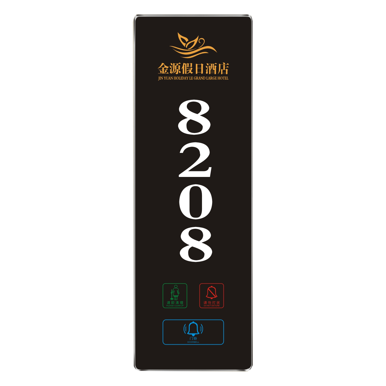 2、客人按下房間內的"請勿打擾”開關,液晶屏的"請勿打擾”圖案背光亮起,門外顯示屏中提示請不要打擾,此時門鈴按鍵不起作用。